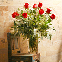 A dozen premium roses in a vase accented with foliage. Available in a variety of colors.
