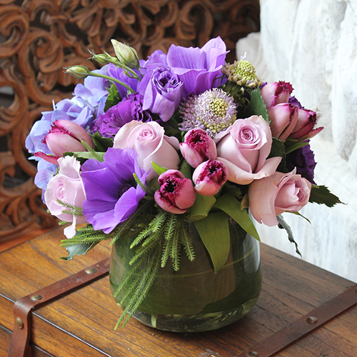 Shades of purple flowers make this a store favorite. Available larger or smaller. Please call for details